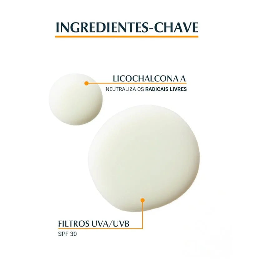 Possui também FPS 30 que oferece proteção UVA/UVB com o antioxidante Licochalcona A protegendo as células das camadas mais profundas da pele neutralizando os radicais livres causados pela luz UV e luz visível.