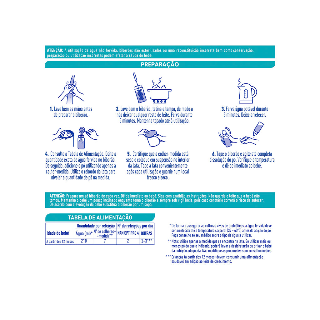O Leite Nan OptiPro HM-O 4 é um leite de crescimento para bebés a partir dos 24 meses de idade como parte líquida da sua alimentação, antes da introdução do leite de vaca. Nota importante: Nan OptiPro HM-O 4 não é um substituto do leite materno mas uma bebida láctea infantil (leite de crescimento) especialmente indicada para crianças saudáveis a partir dos 12 meses de idade. A amamentação deverá prolongar-se durante o maior tempo possível.